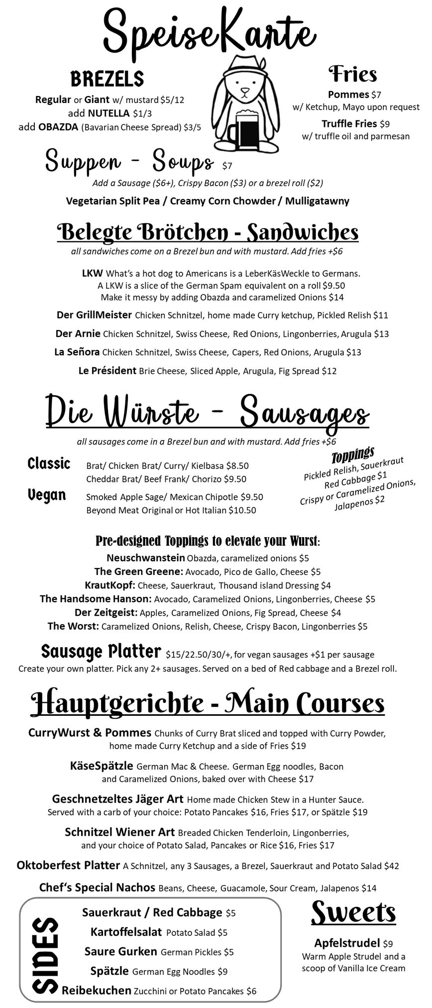 Kitchen hours: weekdays 5-10pm, 4-11pm on weekends, Brezels are available anytime!